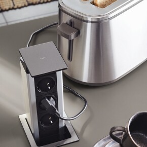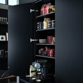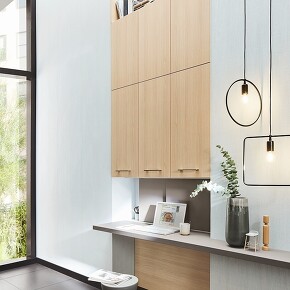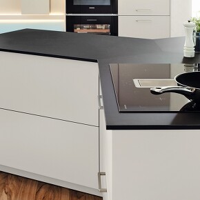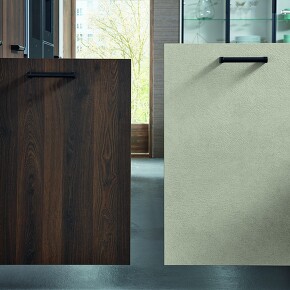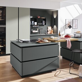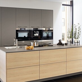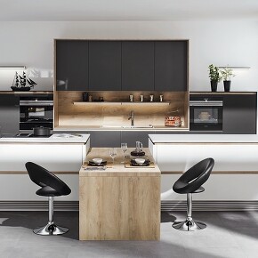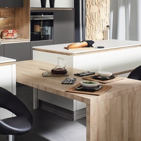 Von der Frühstücksbar bis zum Home Office – die neue Küche ist offen für alle(s). Per Fingertipp fahren Auszüge oder Steckdosenleiste heraus. In extra hohen Oberschränken verschwindet Vieles. Die zarte, matte Eichenstruktur des Dekors spiegelt die teuerste Furnierauswahl wider. Die Hochschränke aus dem grauen pflegeleichten Fenix sind flächenbündig in die Wand integriert und bieten zusätzlich Stauraum.