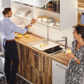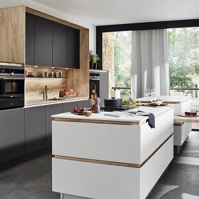 Die Küchenfront der LINE 45 ist die ergonomisch überzeugende, grifffreie Kompaktklasse. Bildschön: die hinterlegte Holzoptik als Gestaltungselement. Neben dem Backofen bieten die Innenauszüge optimalen Zugriff auf Vorräte und Kochgeschirr. Das elegante, flächenbündig eingefügte Spülmodul ist unauffällig in die Nische integriert. Zwischen den zwei Inseln ist der Essplatz eingebaut.