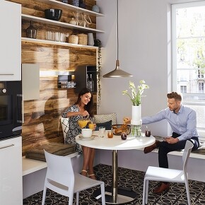 Eine besondere Note erhält diese Ballerina-Küche durch die Kombination mit dem Dekor Wildeiche als Wandverkleidung. Lifttüren garantieren mehr Bewegungsfreiheit. SMART Glas in Achatweiß glänzt edel, ist stoßfest, kratzunempfindlich und pflegeleicht. Der Kochfeldabzug lässt Platz für eine Regalrückwand. Die integrierte Sitzbank ermöglicht die Raumnutzung der kleinen Küche als Büro, Esszimmer, aber auch zum Kochen mit Freunden.