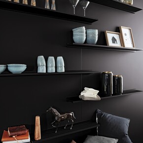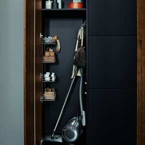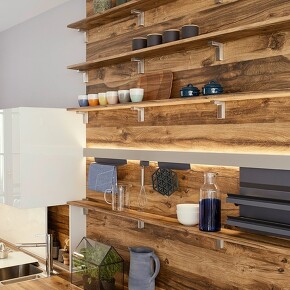 Hinter Fronten aus ausdrucksstarkem Nussbaumholz verbergen sich nützliche Funktionen: Ein Besenschrank findet hier genauso Platz wie Geschirr auf herausziehbaren Tablarböden oder Ihre Küchenmaschine. Die wie schwerelos schwebenden Regalböden lassen sich nach eigenem Gusto anordnen. Alles, was man zum Kochen benötigt, kann hier griffbereit abgestellt werden. Wohnliche Accessoires kommen wunderschön zur Geltung