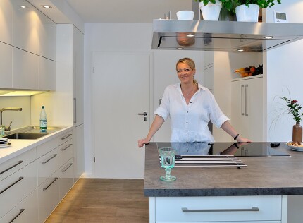 Offene Küche mit Über-Eck-Küchentheke, bei der die eine Hälfte fürs Kochen ausgerüstet ist und die andere zum Spülen – so entsteht ein famoses Arbeitsdreieck mit schönem Ausblick! Auch aus der anderen Richtung betrachtet, nicht zuletzt weil die in den Raum ragenden Ecken harmonisch gerundet sind.
