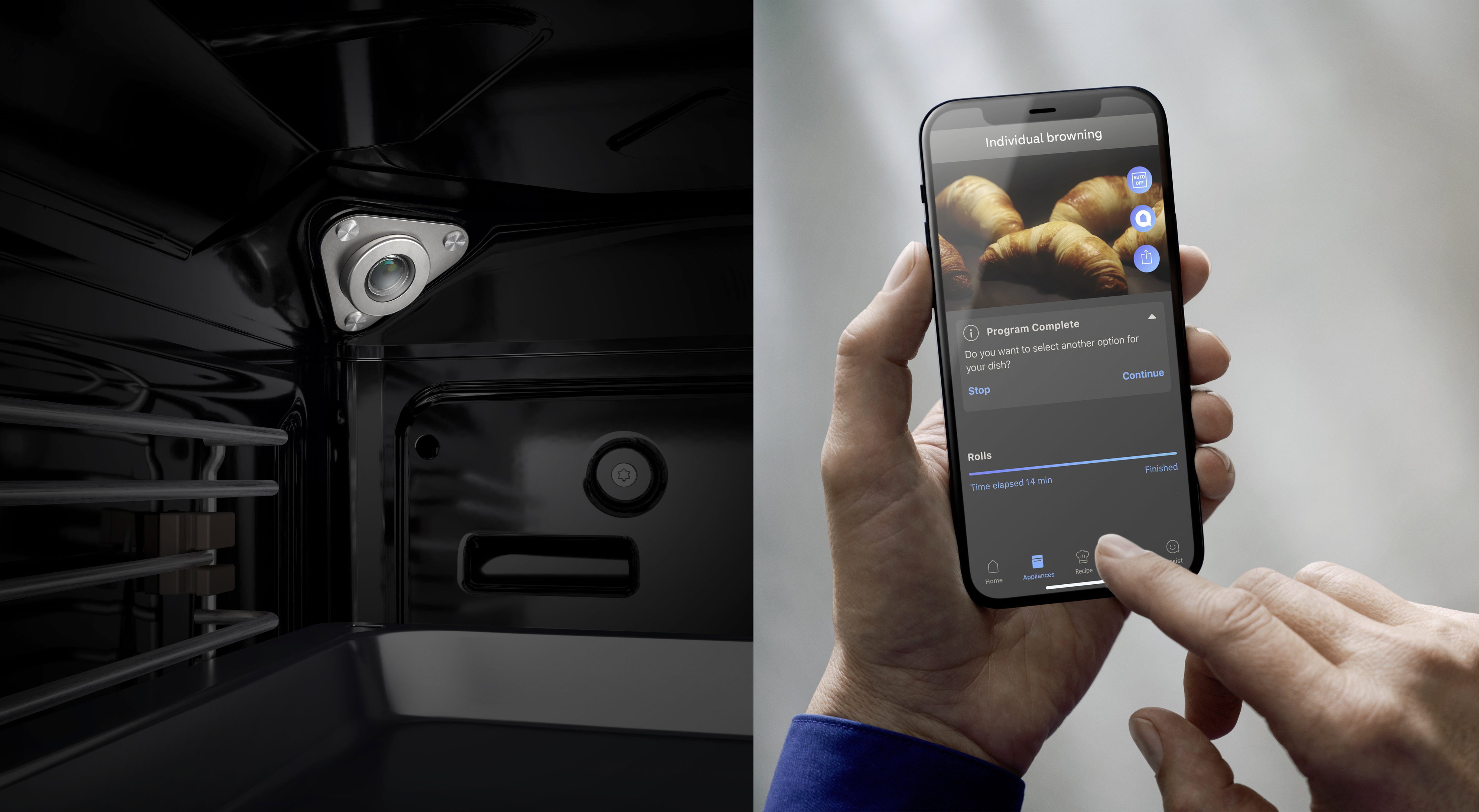 Mit Kamera und künstlicher Intelligenz überwacht der Bräunungssensor den Backvorgang und sorgt dafür, dass jedes Gericht genau den gewünschten Bräunungsgrad erreicht.