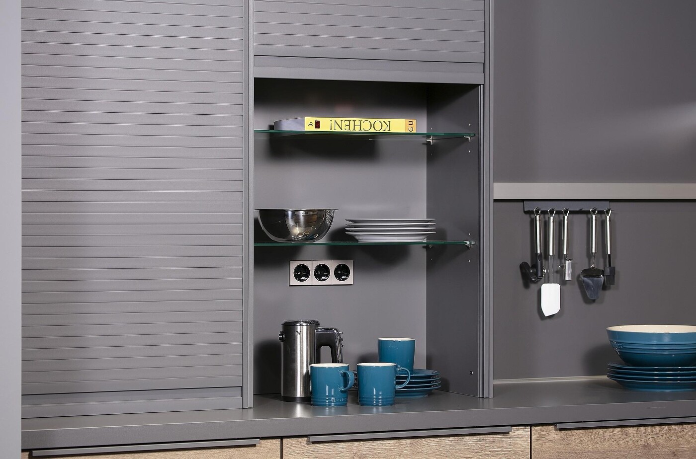 Das nebenstehende Küchenbeispiel zeigt, wie praktisch das ist: Vieles, das man täglich benötigt, kann hier schmutzsicher und trotzdem griffbereit verstaut werden. Und die Jalousie arretiert an jeder Stelle, kann also halb, ganz oder nur zu einem Drittel aufgeschoben werden. Ganz ohne dass im geöffneten Zustand Türen im Weg sind :-)