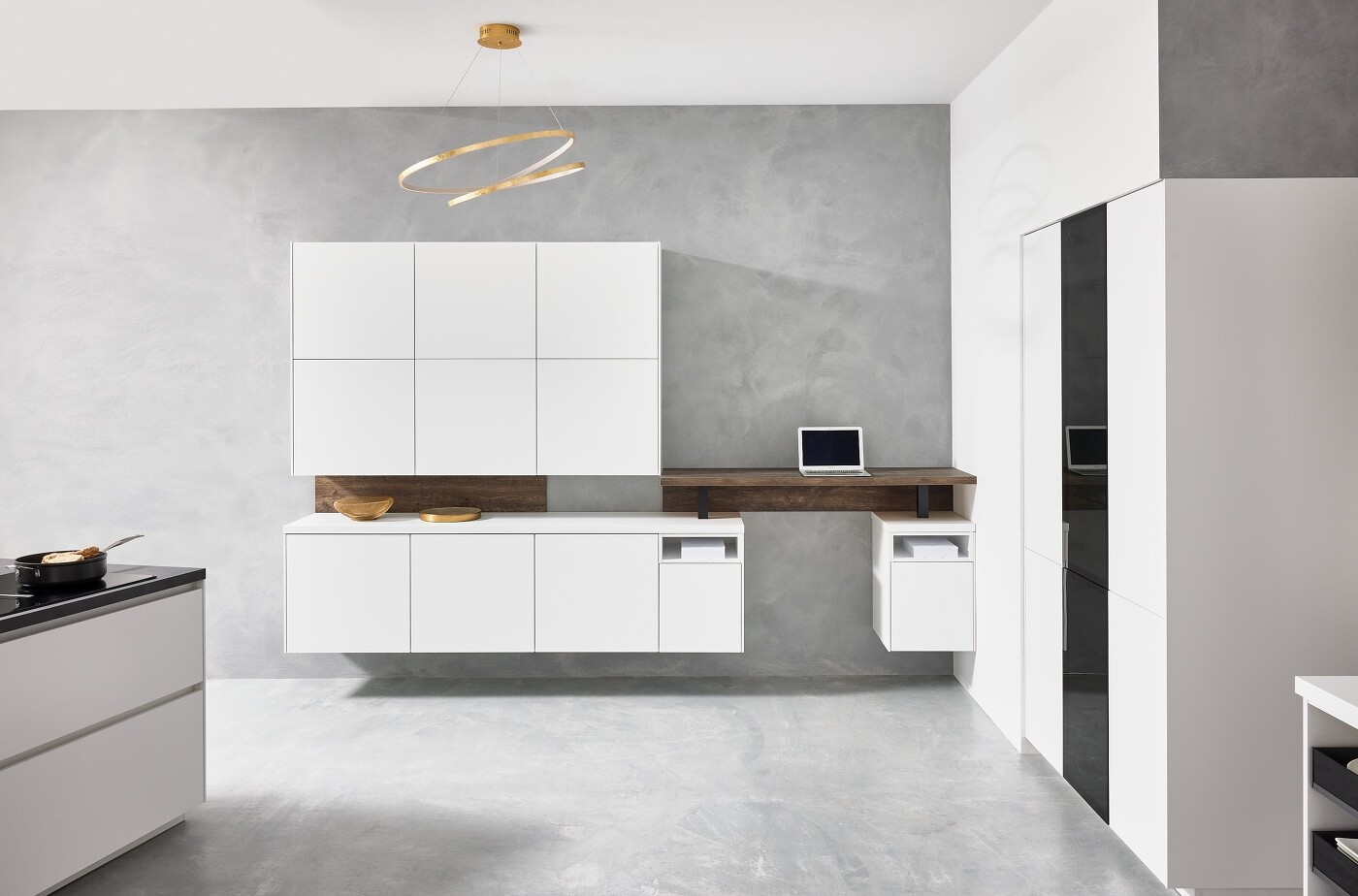 Minimalistisches Küchendesign schafft bei diesem Küchenbeispiel ganz neue Effekte durch grifflos reduzierte Frontengestaltung in Kristallweiß. Spannend auch der besondere Ein- und Aufbau der solistisch präsentierten Einzelelemente: