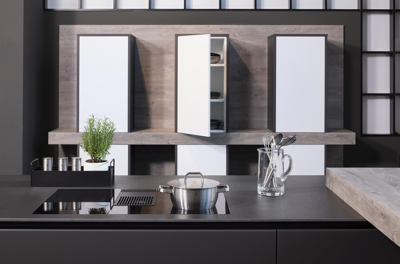 Kubistische Gestaltung kennzeichnet diese Komposition aus symmetrisch gehängten grifflosen Küchenschränken, die sich auf Antippen öffnen. Die drei weißen Hängeschränke wirken vor der Holzwand im breiten schwarzen Rahmen wie skulpturale Designobjekte. Stauraumschaffung steht für Liebhaber solchen Küchendesigns nicht im Vordergrund. Hier geht es um puristische Ästhetik in einer auf das Wesentliche reduzierten Formensprache.