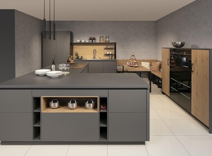 Gepaart mit den darüber angebrachten Glas-Lamellen-Schränken kommt diese elegante Schwarz-Weiß-Gestaltung besonders gut zum Tragen. Wenn es genau solche Küchenideen sind, die Sie sich von Ihrem Küchenstudio wünschen, sind Sie bei uns an der richtigen Adresse!