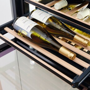 Perfekt temperierter Wein auch in großen Flaschen: Die einzelnen Stege lassen sich erstmalig sowohl in Längs- als auch Querrichtung versetzen, so dass auch Flaschen mit großem Durchmesser wie z. B. Magnum-Flaschen sicher gelagert werden.