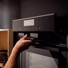 Eine Backofentür mit Slide&Hide® lässt sich nicht nur wie gewöhnlich aufklappen, sondern verschwindet beim Öffnen mit nur einem Handgriff leichtgängig in einem Fach unter dem Backraum. Ein spezielles Dämpfungssystem ermöglicht, dass die Tür geräuschlos und in einem Schwung in das Gehäuse gleitet. Der mitdrehende Türgriff schwenkt währenddessen entgegen der Türbewegung mit und liegt dabei stets in gleicher, angenehmer Position in der Hand. Keine Frage: So entsteht gleich viel mehr Bewegungsfreiheit in einer Küche. Für mehr Platz beim Kochen und Backen. Und das Beste dabei: Der Garraum ist bei einem Slide&Hide® Backofen genau so groß wie bei einem Backofen mit Klapptür.
