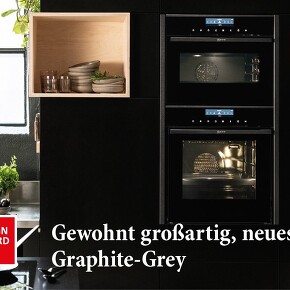 Die Marke NEFF zeichnet sich ferner durch ihren hohen Designanspruch aus. Für die neue Gestaltungslinie Graphite Grey in Kombination mit Seamless Combination wurde NEFF 2021 mit dem IF Design Award ausgezeichnet. Aus diesem neuen, matt gebürsteten Edelstahl sind Lisenen und Griffe der Einbaugeräte gefertigt. Das sieht toll aus, fühlt sich gut an und passt perfekt zu den aktuellen Farbtrends in der Innenarchitektur: Offene multi-funktionale Wohnräume und eine schier unendliche Auswahl an Grautönen sind das neue zeitgemäße Design. Während sich das Leben und die Trends konstant verändern, ist es essentiell, für sich eine Balance aus Fortschritt und Nachhaltigkeit zu finden. Wie immer Sie sich bei Ihrer Küchengestaltung entscheiden – das neue NEFF-Design in Graphite Grey fügt sich wunderbar in Ihr Zuhause ein.